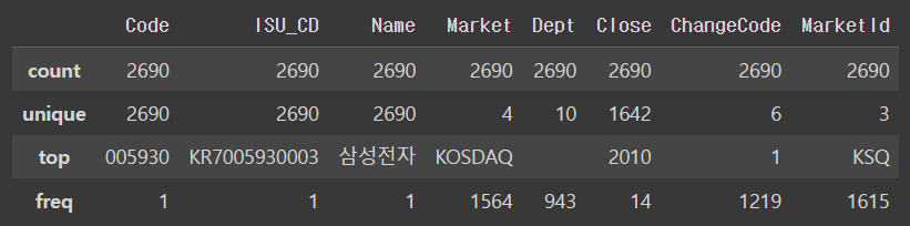 cols_ren = {'회사명':'Name', '종목코드':'Symbol', '업종':'Sector', '주요제품':'Industry',