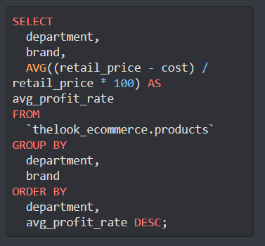 # products 테이블에서 deparment(Men, Women) 별로 평균 이익률이 높은 brand top 5를 조회하는 SQL문을 작성해주세요. # 이때 결과는 남성 브랜드가 먼저 나타나도록, 평균 이익률이 높은 순서대로 해주세요.